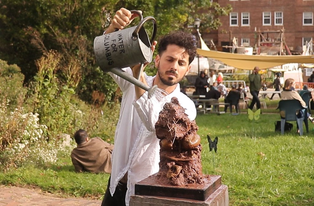 We found sinergy exploring how we choose to remember the past –understanding that doing so is a way of moving through the present. Ours materialized in watering Columbus’ bust with water from the East River.